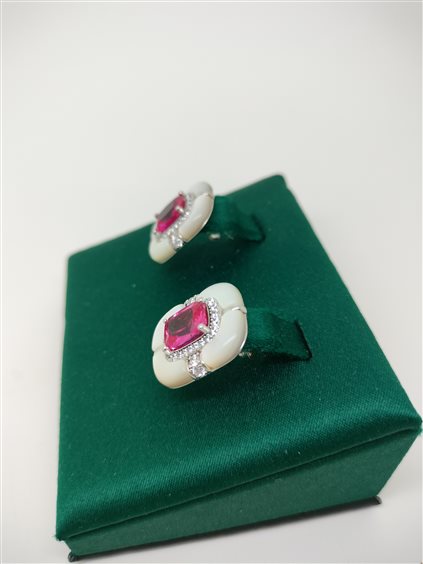 ORECCHINI IN ARGENTO 925 CON MADREPERLA E ZIRCONIA CUBICA CENTRALE DI COLOR FUCSIA.GIOIELLI PRODOTTI IN ITALIA.
