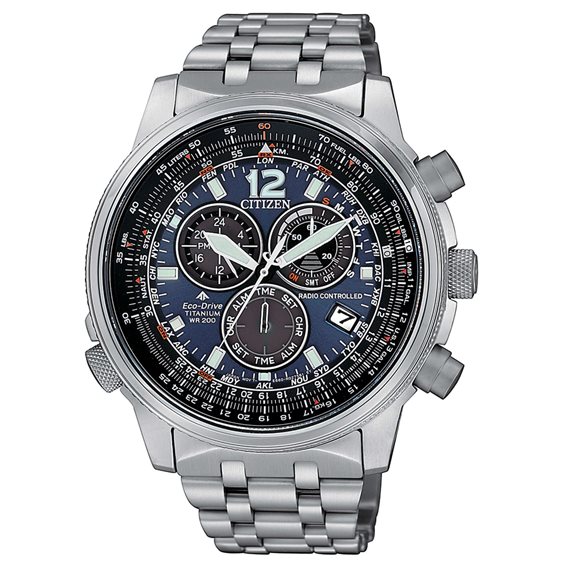 Orologio uomo Cronografo Multifunzioni Citizen CRONO PILOT SUPER TITANIO. Movimento Eco-Drive a carica luce con riserva di carica di 10 mesi(fino a 3 anni in modalità risparmio energetico) con funzione di radiocontrollo multibanda a 5 canali con ricezione dei segnale orario Europa, USA, Giappone e Cina. World Time con orario di 24 città del mondo e ora UTC - allarme (sveglia) - calendario perpetuo - cronometro 1/20 di secondo per un massimo di 60 minuti - indicazione livello riserva di carica. Cassa in Super Titanio ghiera girevole bi-direzionale con sistema regolo calcolatore (tramite corona a ore 8). Vetro zaffiro antigraffio. Quadrante blu indici e lancette luminescenti. Bracciale regolabile in Super Titanio chiusura di sicurezza con pulsanti. Impermeabile 20 bar (atm) Libretto Istruzioni e Scatola Originale. Garanzia 2 anni.