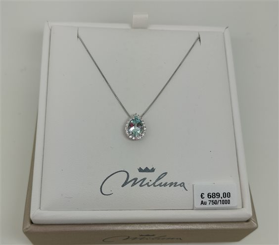 GIROCOLLO IN ORO BIANCO 18 KT CON PENDENTE TAGLIO GOCCIA IN ACQUAMARINA IMPRIZIOSITO DA PICCOLI DIAMANTI.