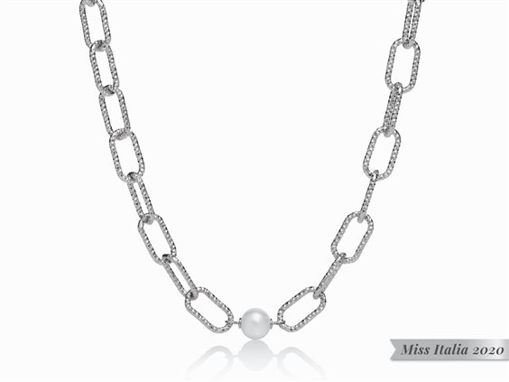 Collana con maglia a catena da 16 mm con lavorazione diamantata in argento 925 e con perla coltivata bianca ø 9-9,5. Lunghezza cm 44 con allungamento fino a 46 cm.