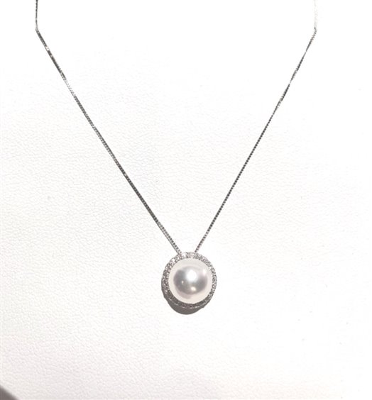 collana veneziana in oro bianco 750/..con ciondolo in oro bianco con al centro una perla Akoya da mm 8-8,5 contornata con 22 diamanti GSI per un totale di 15.4 punti di carato che aumentano la luminosità della perla