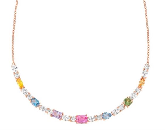 Collana in Argento 925 con Cubic Zirconia mix colori e forme. Rivestimento superficiale in Oro Rosa realizzato mediante bagno galvanico. Lunghezza: 44 cm messo a misura 38 cm. Un'esplosione di colore!