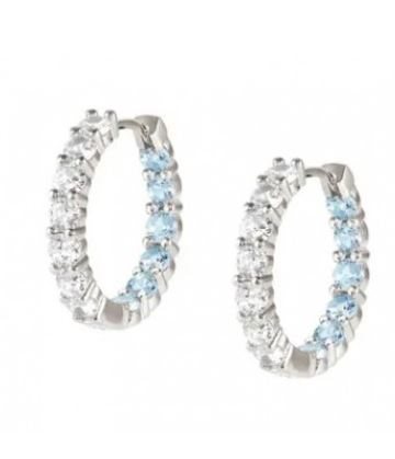 Orecchini a cerchio in Argento 925 con Cubic Zirconia bianchi e celesti, rivestimento superficiale in Rodio bianco realizzato con bagno galvanico. Diametro: 2,1cm.