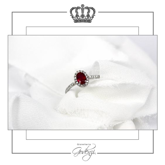 ANELLO IN ORO BIANCO 750/1000,CON RUBINO 0,60 CT CONTORNATO DA DIAMANTI O,21 CT.