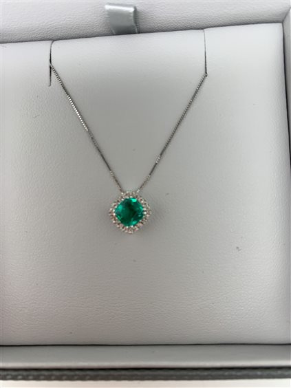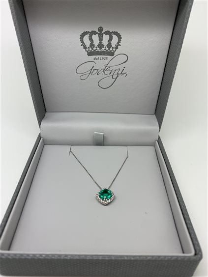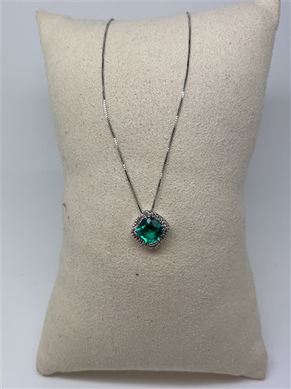 GIROCOLLO DA DONNA IN ORO BIANCO 18KT CON PENDENTE QUADRATO.ZAFFIRO CENTRALE CT 1,00 ARRICCHITO DA BRILLANTI BIANCHI CT 0,19.REALIZZATO IN ITALIA.